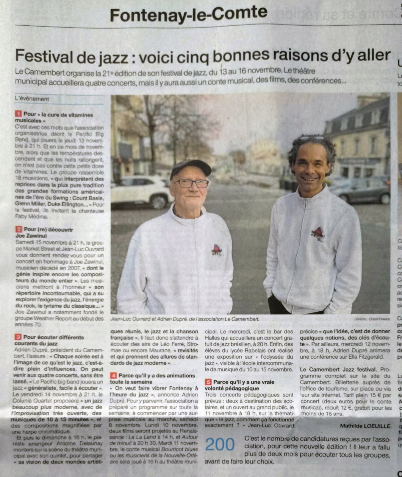 Du lundi 10/11 au dimanche 16/11 au théâtre municipal de Fontenay-le-Comte, en partenariat avec la ville de Fontenay-le-Comte, le collectif régional de diffusion du jazz en Pays-de-la-Loire (CRDJ) et la communauté de communes Pays de Fontenay-Vendée, l’association vous invite à découvrir des artistes régionaux:
